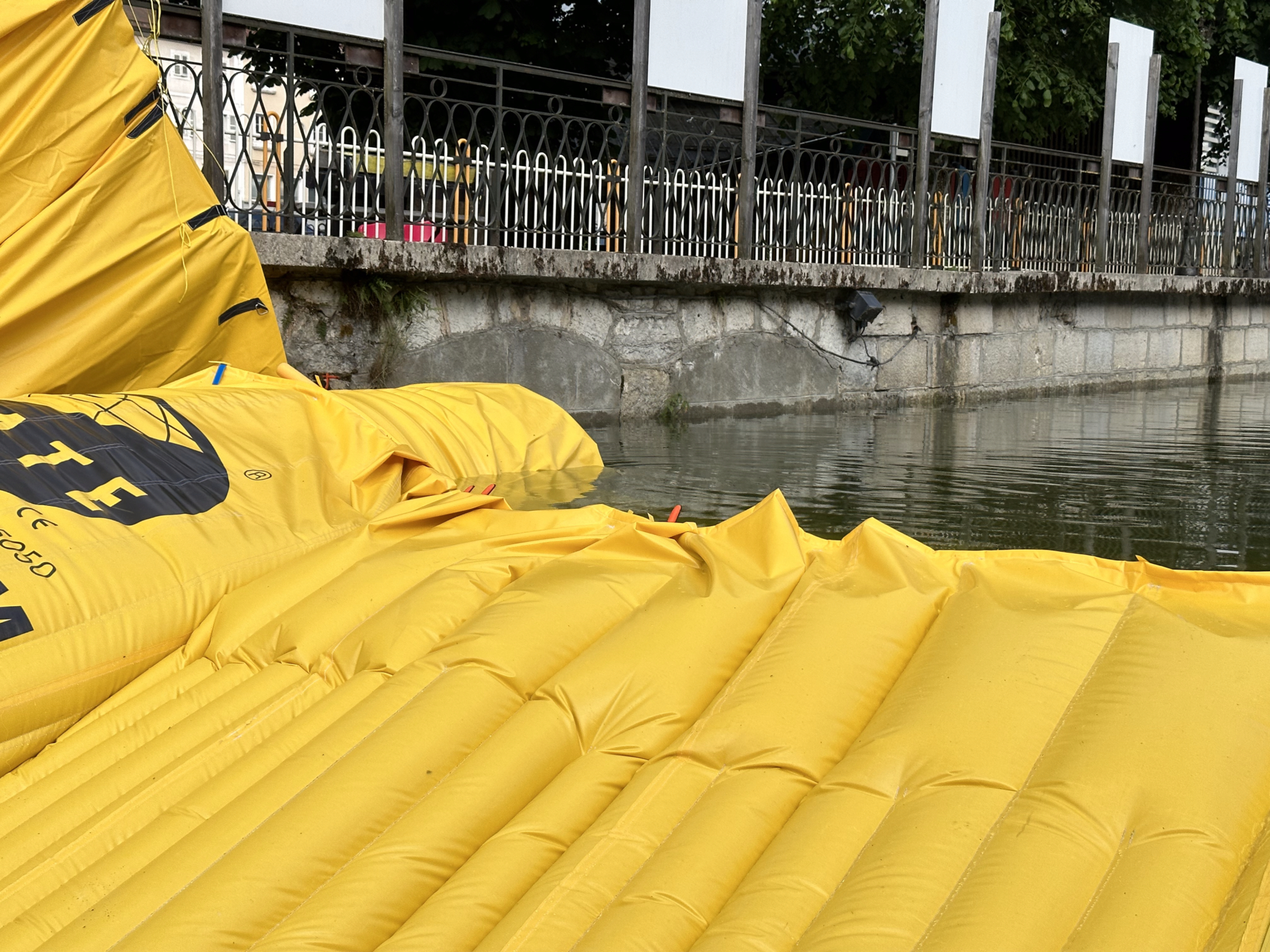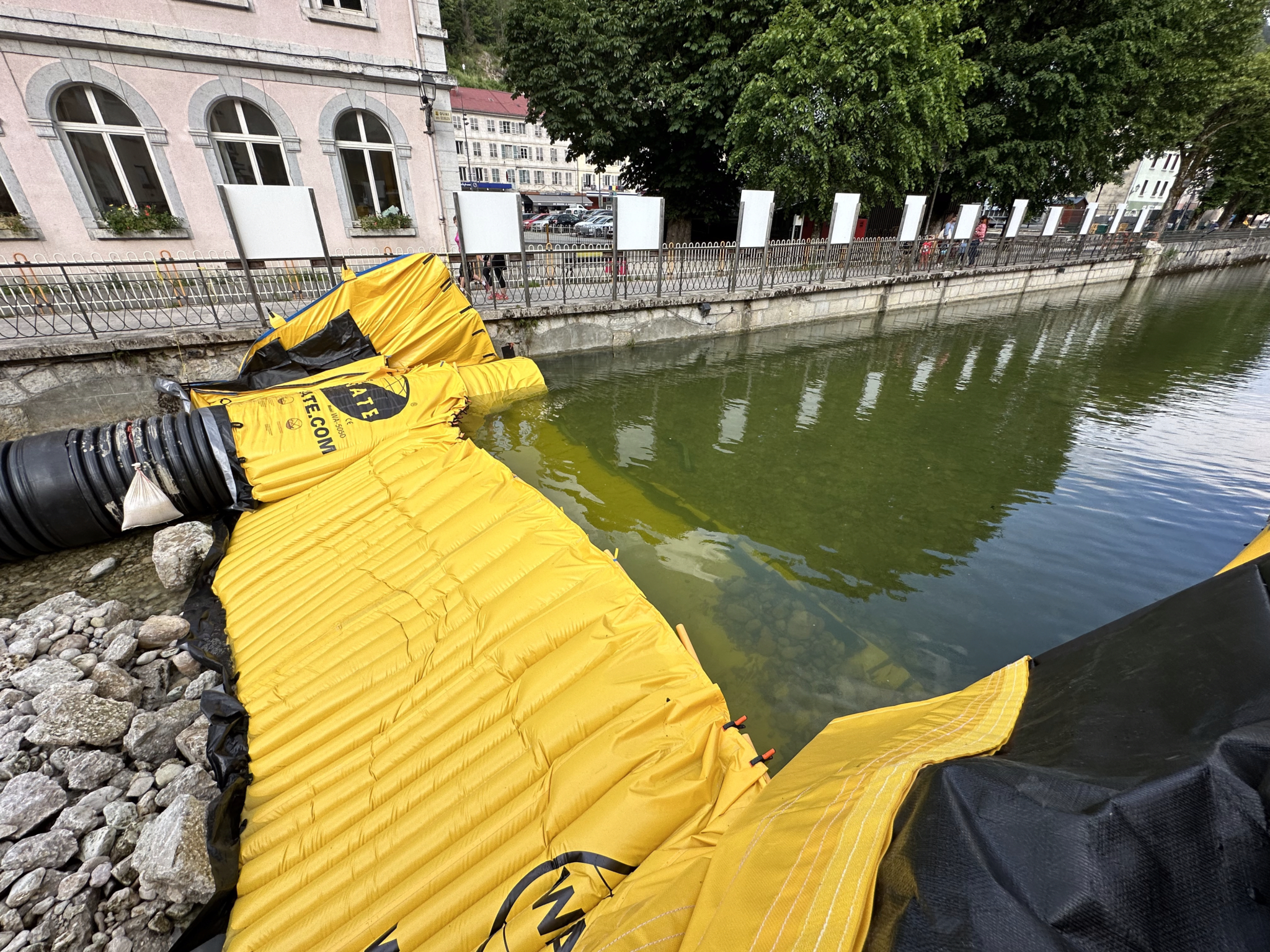 Aval du dispositif : Water-Gate© suit la DN1200 et assure un appui vertical à 90° sur le mur rive gauche. Fixation par cordelettes au garde-corps.