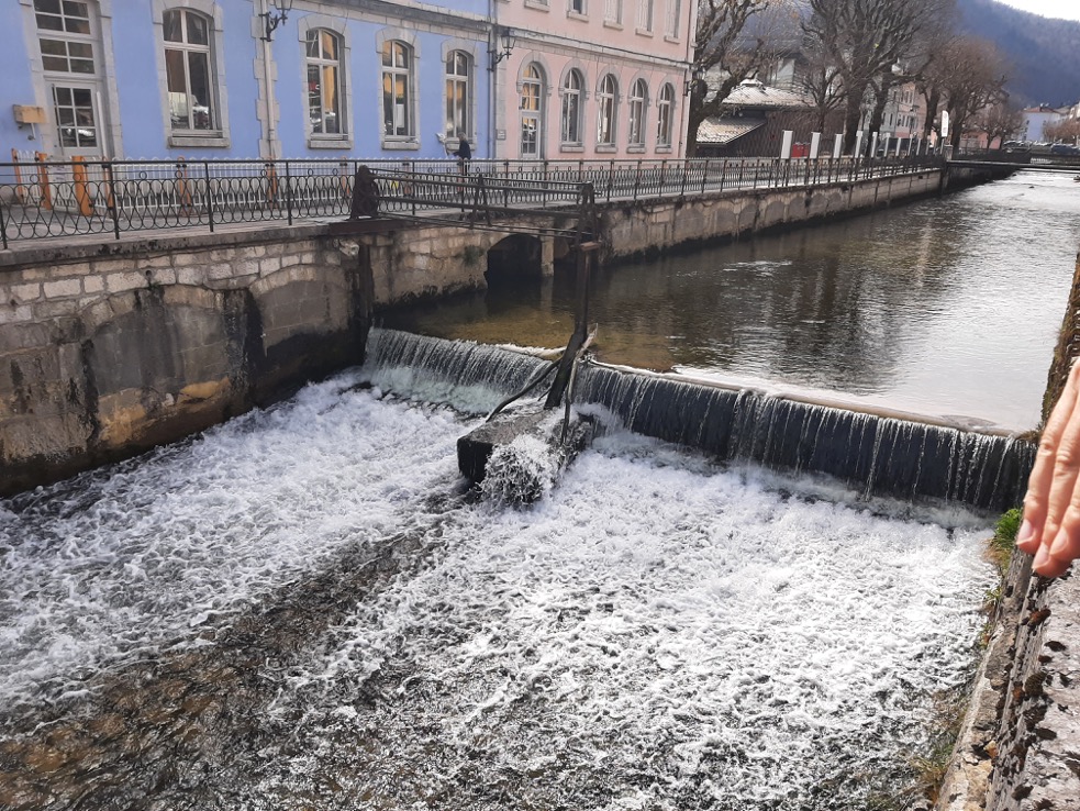 Seuil urbain ancien sur la Bienne à Morez, destiné à être effacé dans le cadre de la renaturation.
