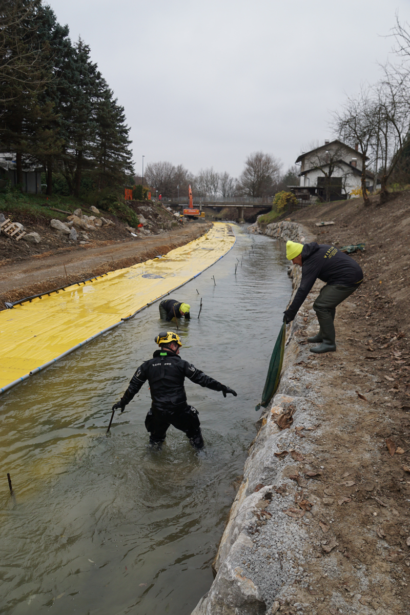 Rénovation de berges en assec sur le Mali Graben – 150 m de batardeaux souples en courant parallèle (Ljubljana)